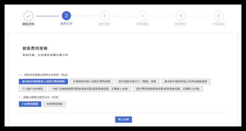 6、选择“基本医疗保险参保人员医疗费用报销”以及需要办理的业务,点击“网上办理”,预检后进入智能填表页面填报相关信息,然后上传附件材料,点击“下一步”,即可完成。