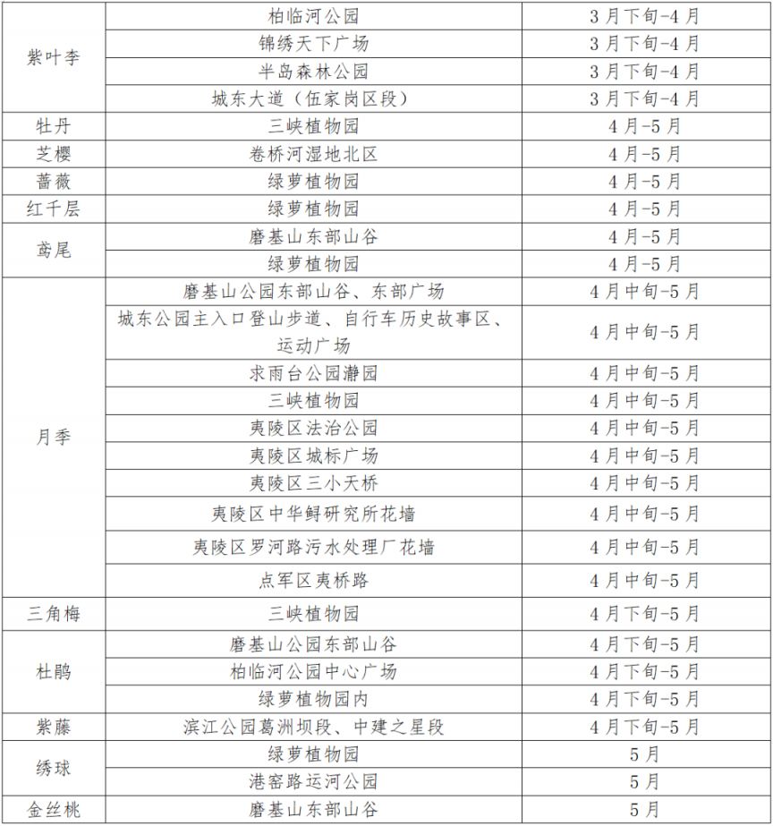 - "樱花":通常在3月中旬至4月初盛开。 - "桃花":一般在3月底至4月初。 - "杜鹃花":4月中旬至5月初。 - "油菜花":3月底至4月初,与桃花、樱花同期。