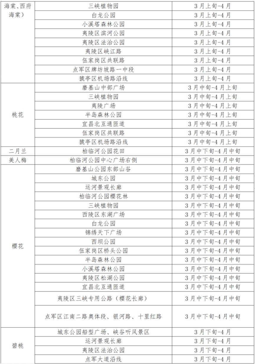 3. "夷陵区" - 时间:3月中旬至4月初 - 特色:以桃花、樱花为主,有多个赏花点。