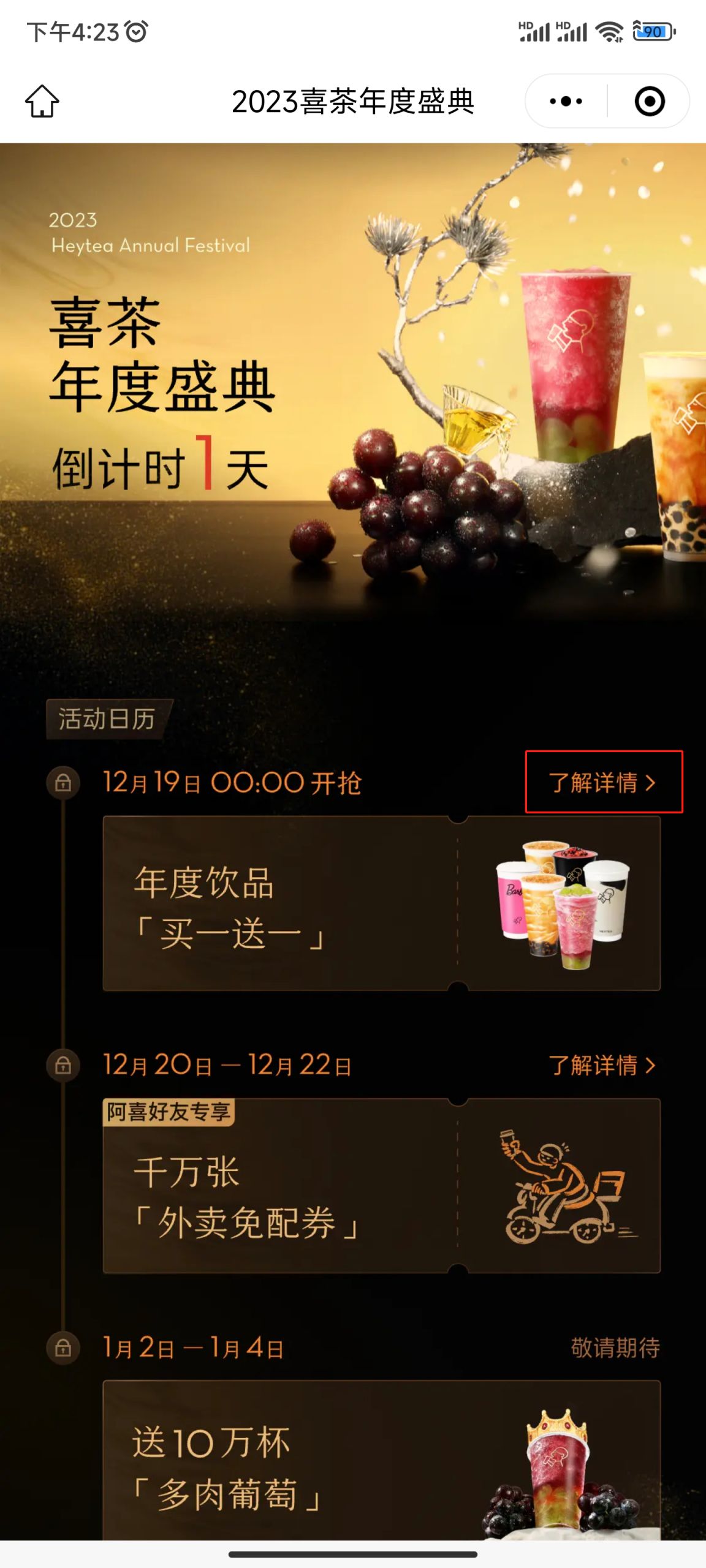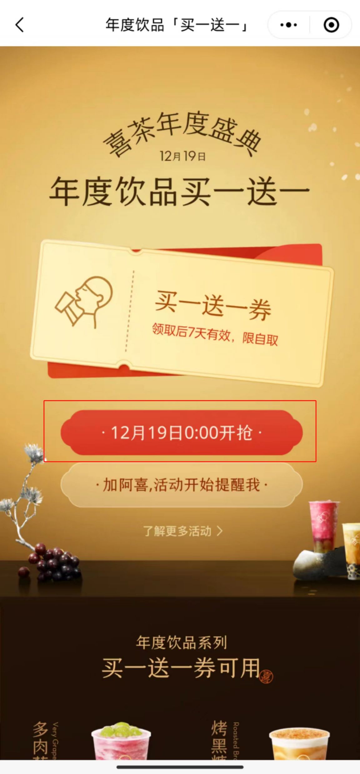 2023年喜茶年度盛典限时“买一送一”狂欢活动即将盛大开启!以下是抢购入口的详细信息: