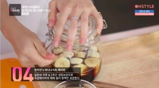 韩志旼的美容方法中,最知名的不外乎就是自製香蕉醋了,香蕉中富含钾,能帮助身体排除水份、消除水肿,身为水肿体质的她曾在节目《Get It Beauty》上分享製作香蕉醋的方法:
