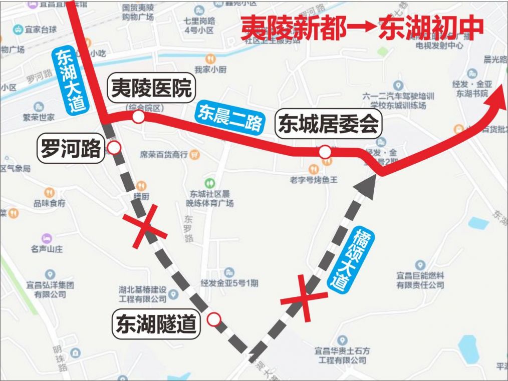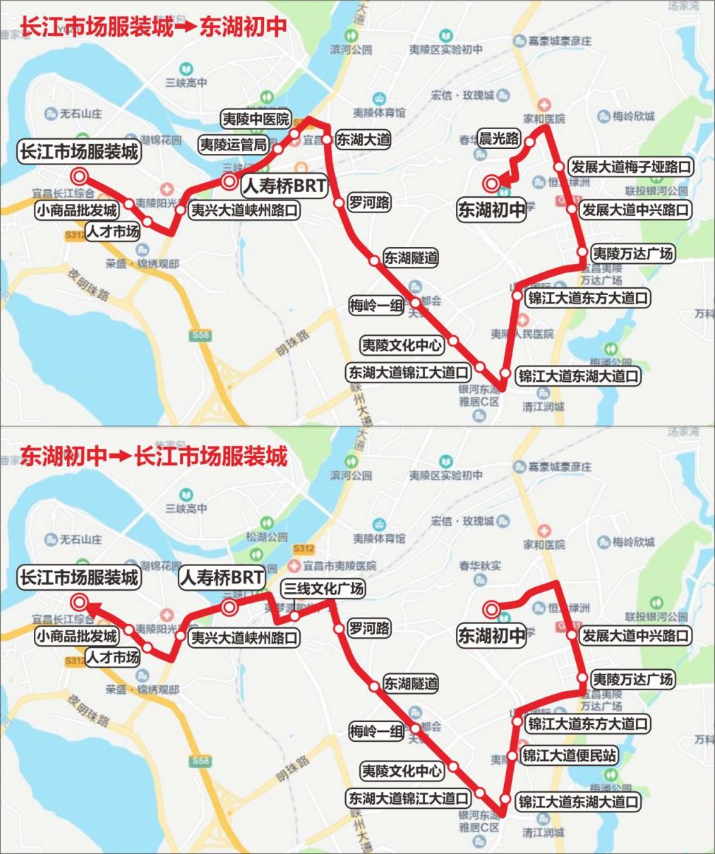 往东湖初中方向:线路按原线运行至东湖大道与东晨二路交叉口后左转,经东晨二路至橘颂大道交叉口后左转恢复原线行驶,取消停靠罗河路站、东湖隧道站,增加停靠夷陵医院站、东城居委会站。反方向线路走向不变,发车时间不变。