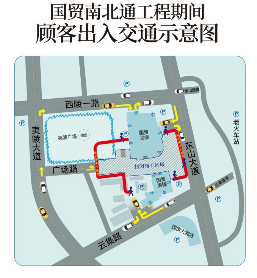 在此期间,由夷陵大道方向前往国贸的车辆,暂不能从广场路入口进场,需行至西陵一路右转,从十六中对面车行口进入国贸北楼停车场;